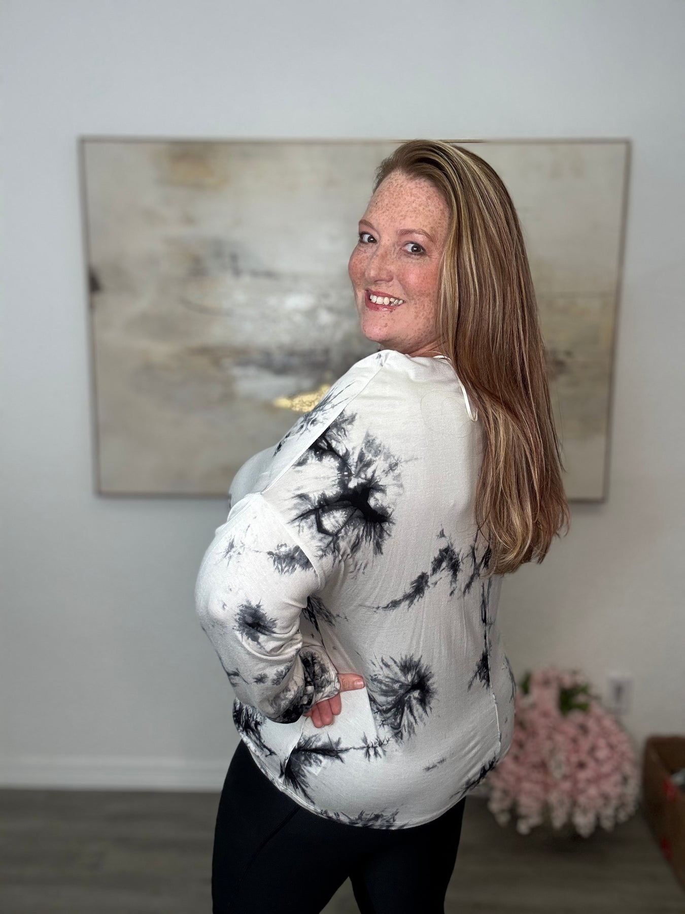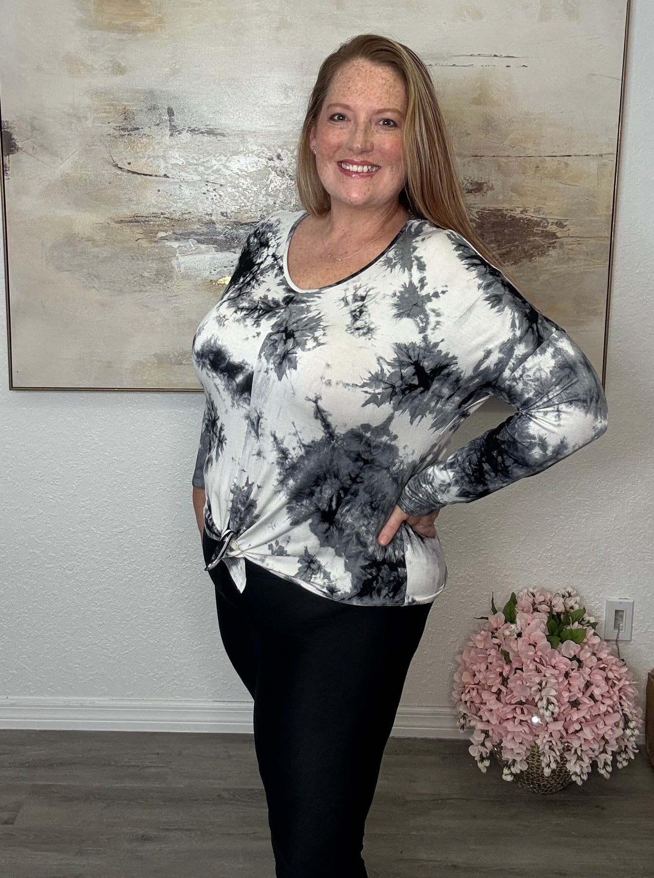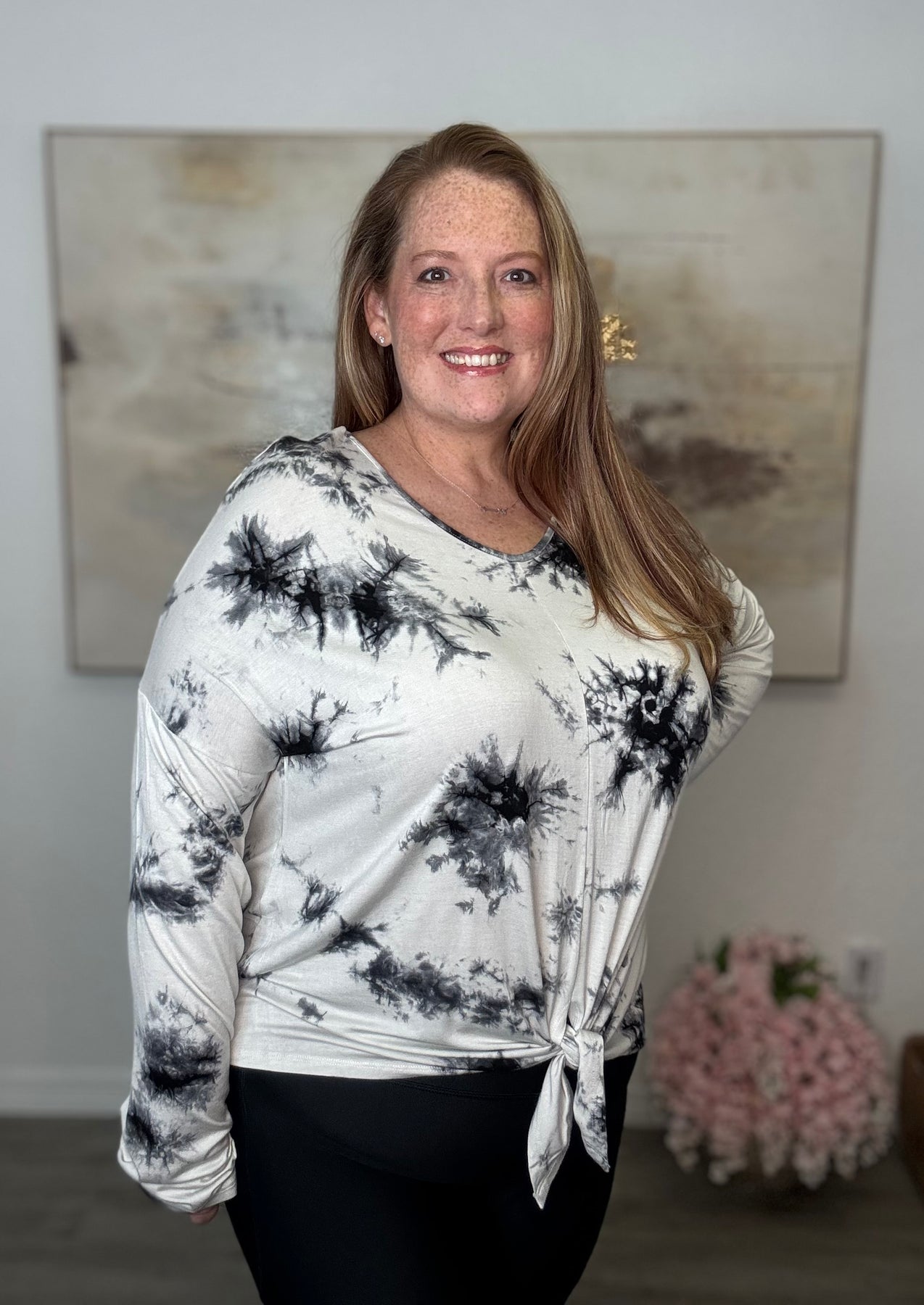 Product Description: A lightweight long sleeve top with a tie-dye pattern and a front tie feature.