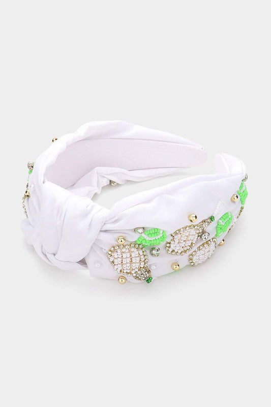 Seed Beaded Tennis Racket Pearl Stone Cluster Embellished Knot Headband