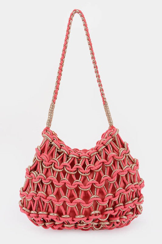 This Handmade Metallic and Cotton Braided Bag is a unique and stylish accessory. It is crafted with a combination of metallic and cotton threads, intricately braided to create a visually appealing texture. The bag features a spacious interior and a sturdy handle, making it both fashionable and functional.