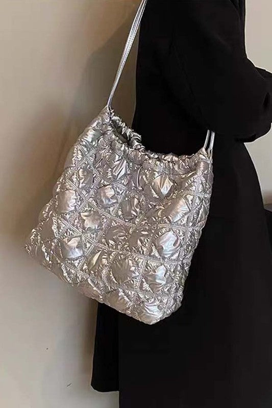 This quilted padding metallic nylon shoulder bag combines style and practicality in one sleek design. Measuring 14" wide, 13" high, and 4.5" deep, it offers ample space for your essentials while maintaining a compact silhouette. The metallic nylon material adds a modern, eye-catching shine, and the quilted padding provides extra durability and comfort. Perfect for elevating your everyday look with a touch of sophistication.