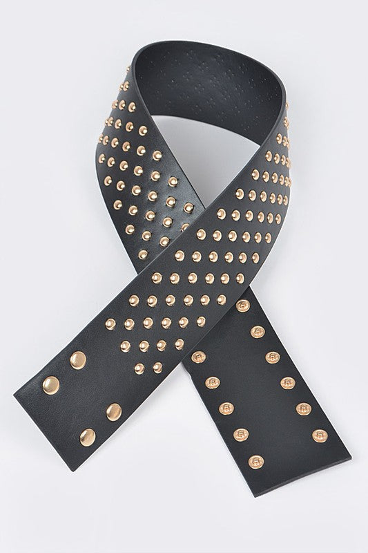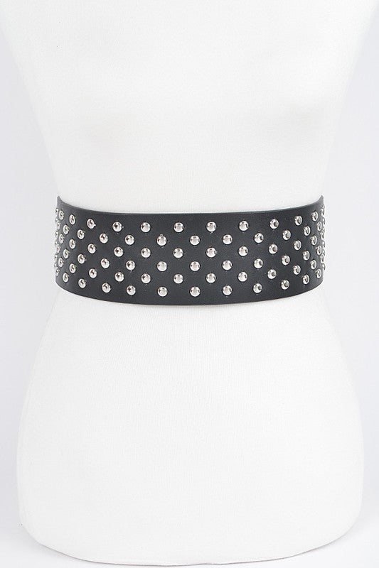 Elevate your style with the Wide Metal Studded Belt, featuring a bold 2.85" width and a 37.5" length for a perfect fit. Its striking metal studs add an edgy touch to any outfit, making it a must-have accessory to express your unique fashion sense. Durable and eye-catching, this belt combines functionality with standout design to complete your look effortlessly.