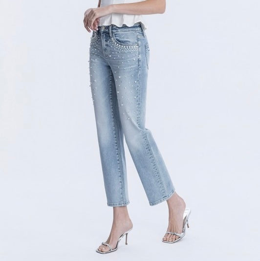 High Rise Pearl & Rhinestone Straight Leg Jeans