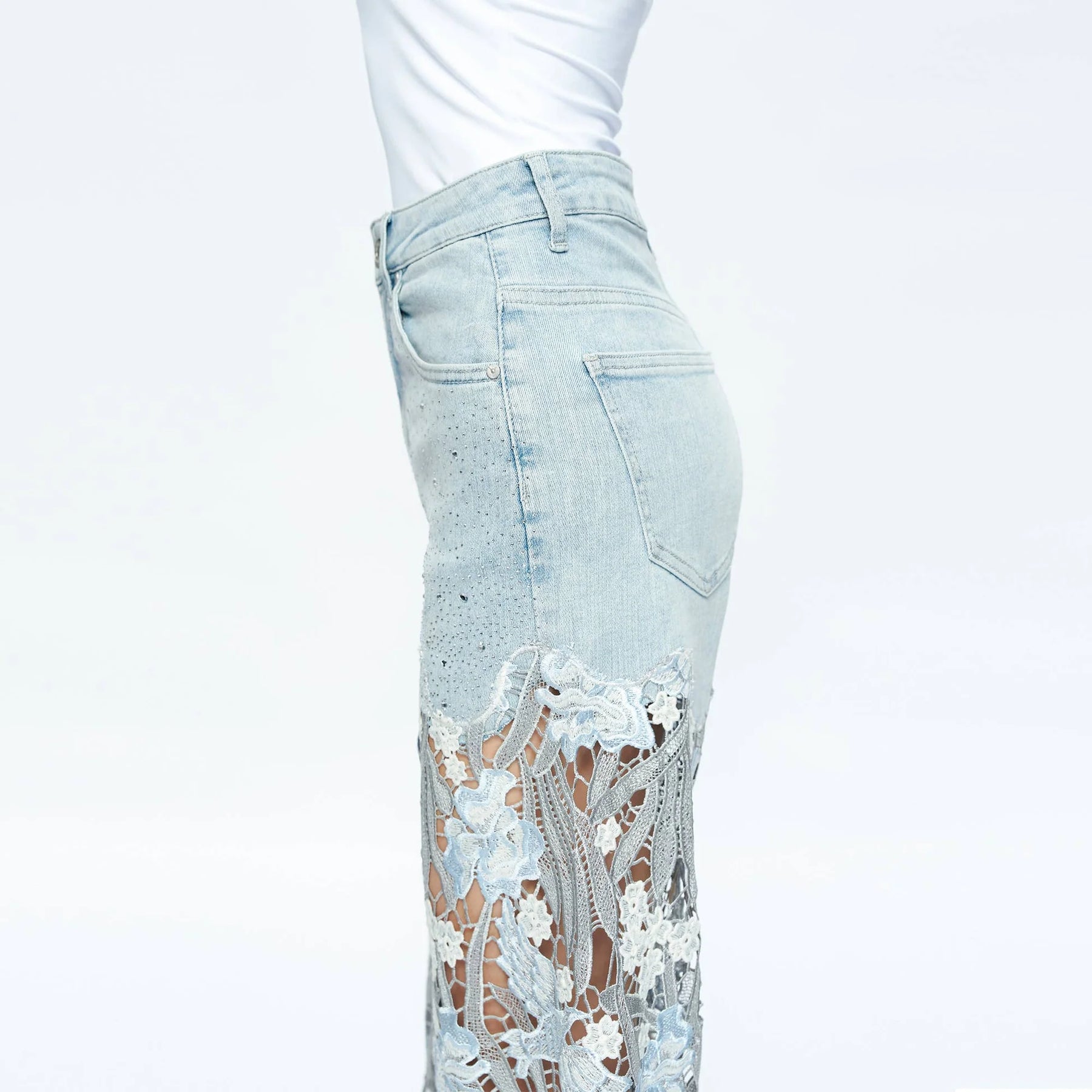 Expertly crafted from comfortable stretch denim, the LESLEY Blue jeans feature a flattering high-rise waist, classic five-pocket styling, and a secure zipper fly. The standout lace-spliced detailing and subtle rhinestone accents along the front add a unique, feminine edge that elevates this everyday denim into a true statement piece.