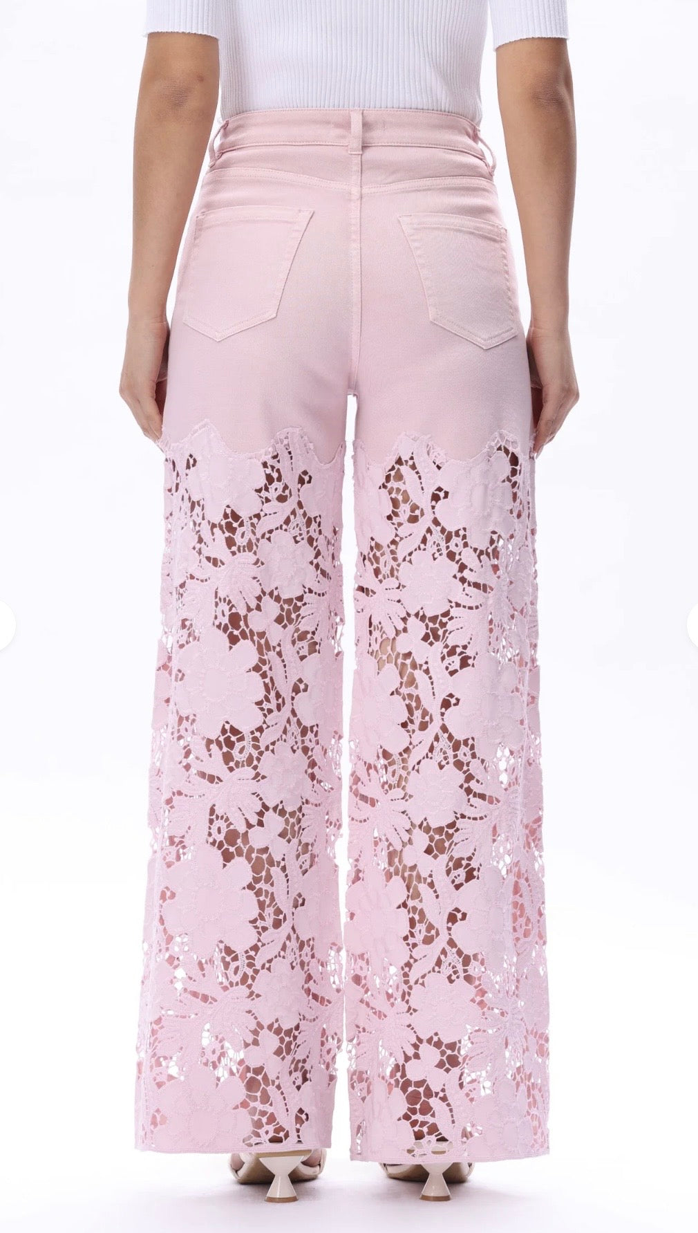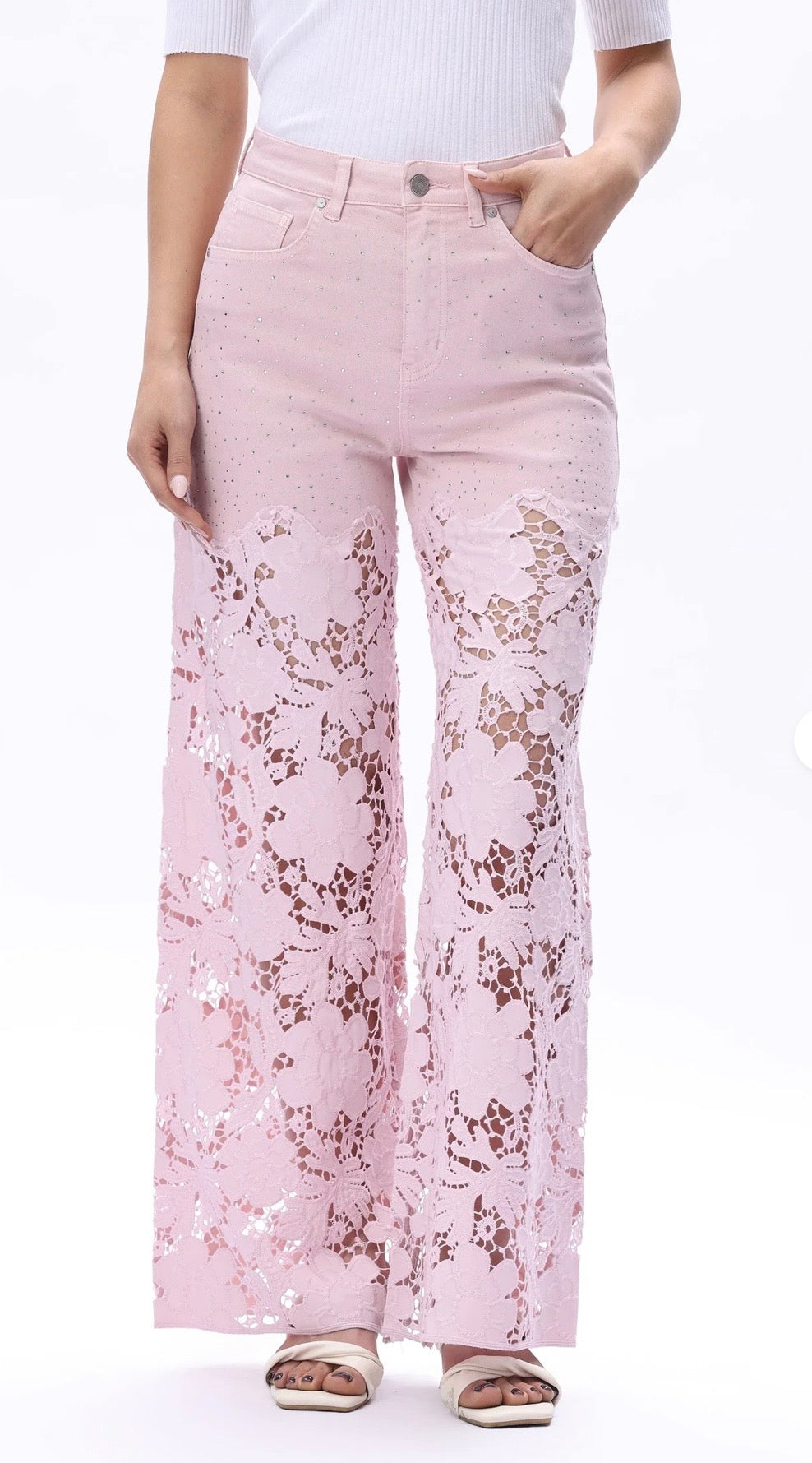 Make a stunning statement with these high-rise wide-leg jeans featuring intricate floral lace and shimmering rhinestones. Crafted with high-stretch denim, they combine a bold, vibrant aesthetic with all-day comfort for a truly unique look.
