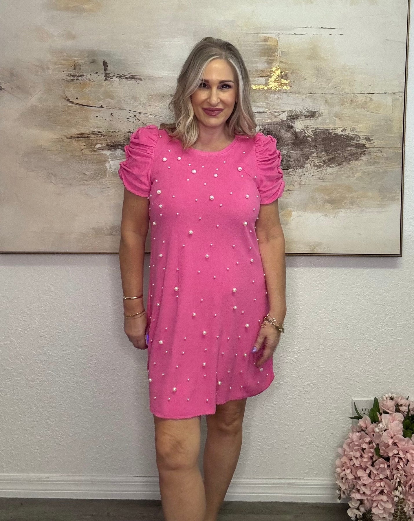 Embrace cozy elegance with this charming terry cloth mini dress featuring delicate pearl details and flattering shirred sleeves.