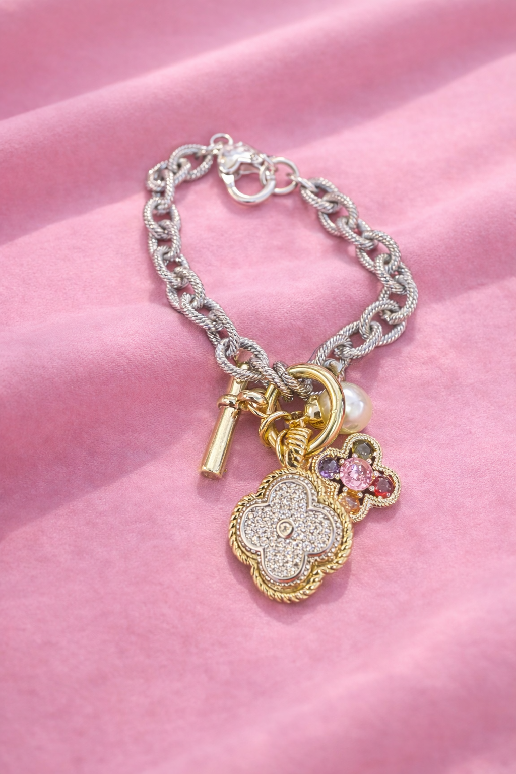 Two Tone Quatrefoil Pearl Charm Bracelet