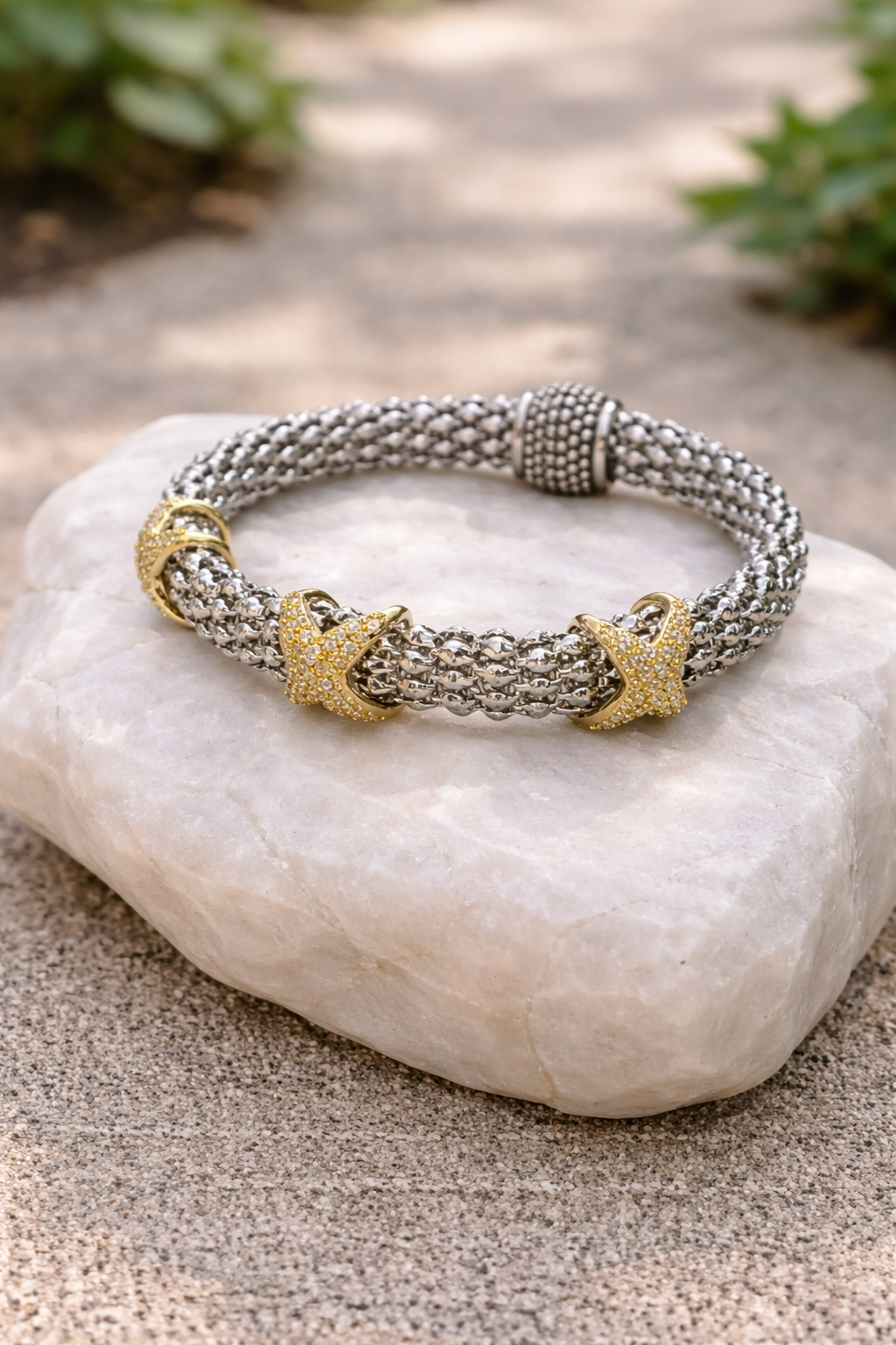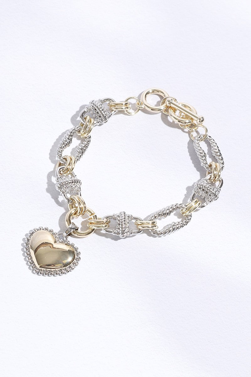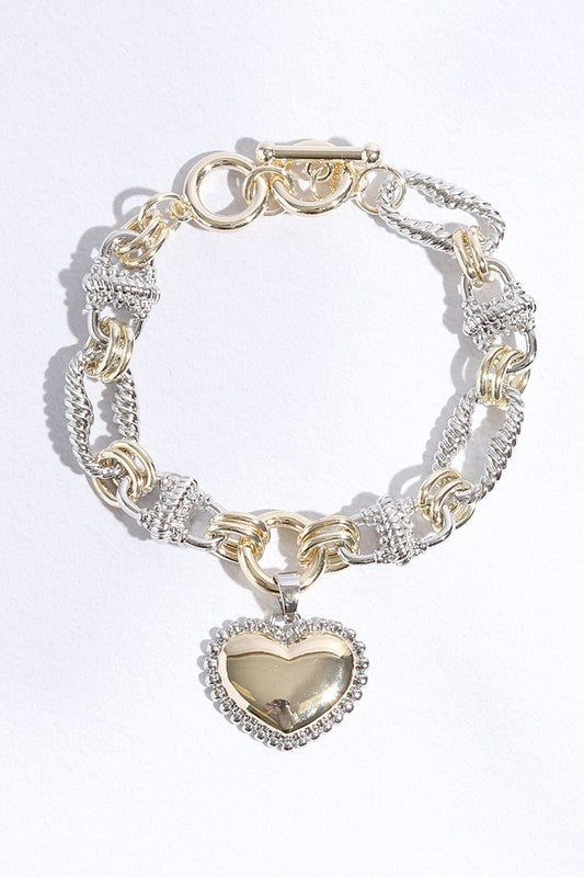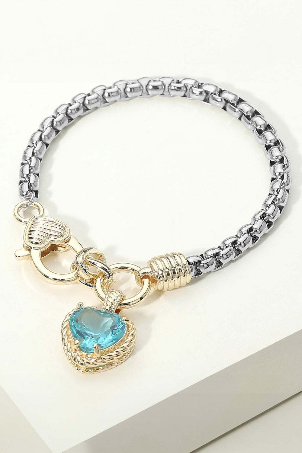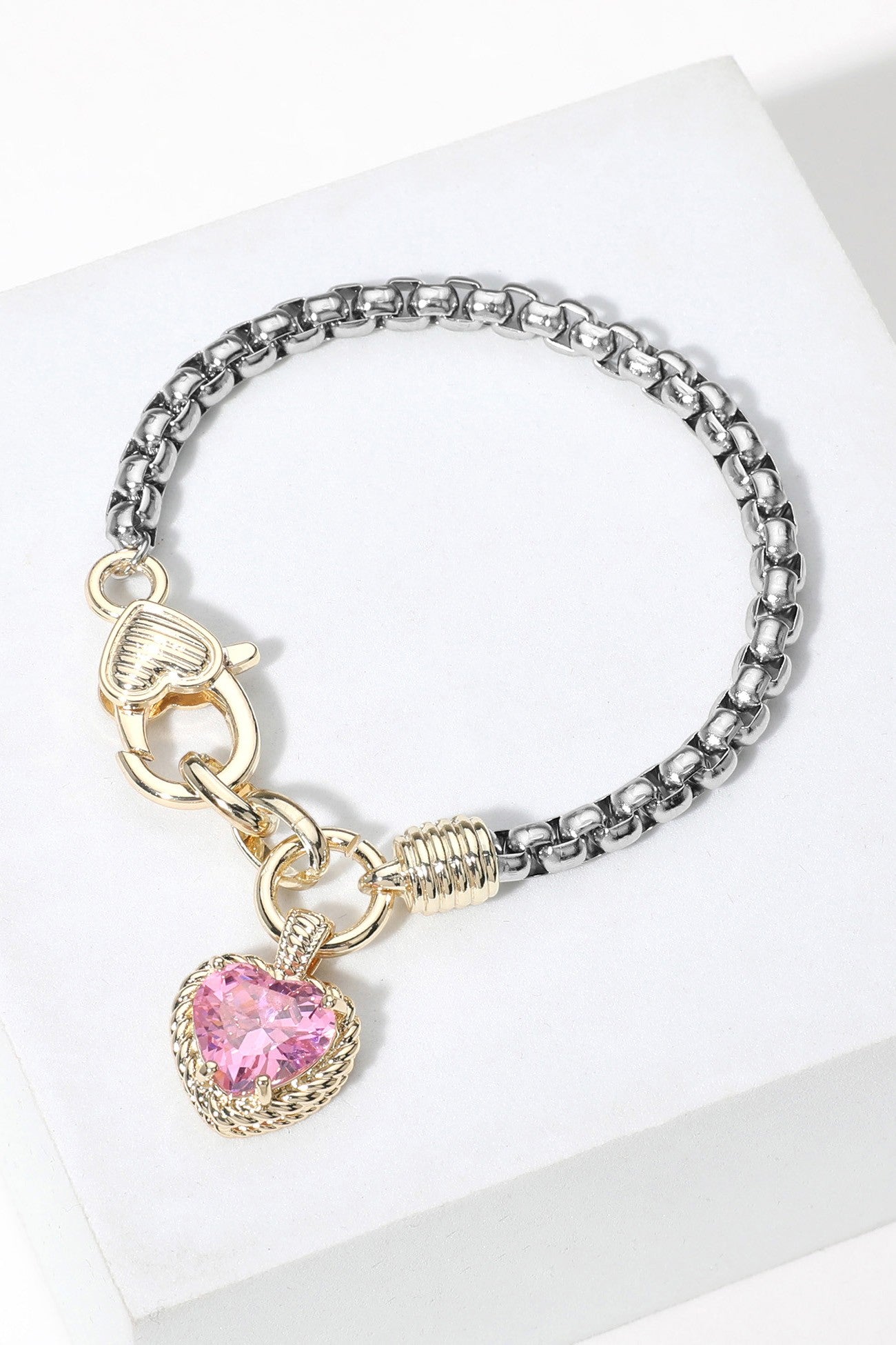 Two Tone CZ Stone Paved Heart Charm Bracelet