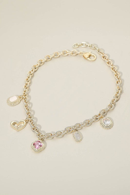 Delicate charm necklace featuring a classic link chain adorned with mixed dangle accents, including heart, oval, and quatrefoil gemstone-style drops. A stylish piece that adds movement and sparkle to any look, perfect for layering or wearing solo for an elegant touch.