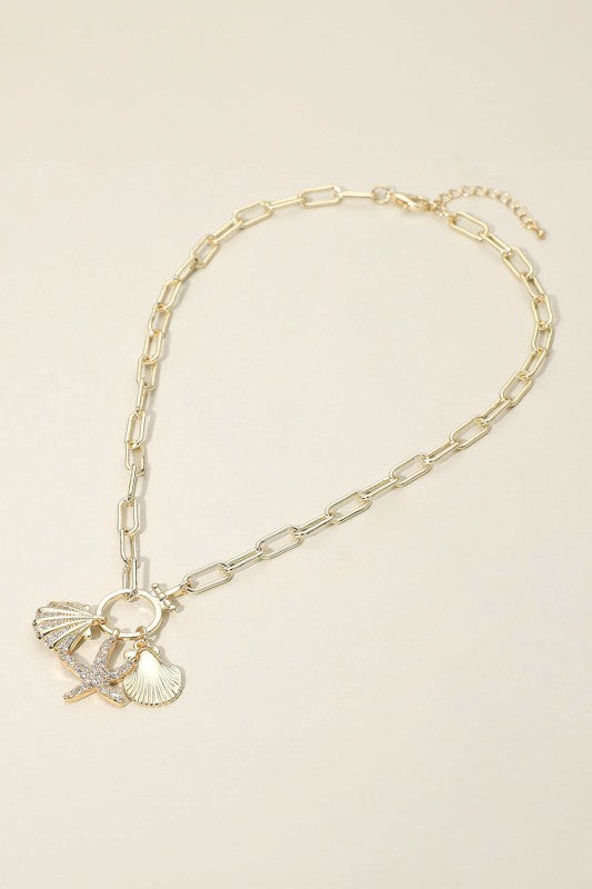 Bring a touch of seaside elegance to your style with this chain-link necklace featuring a trio of coastal-inspired charms, including a shimmering star detail and two sculpted shell accents. Its playful yet refined design adds personality and shine to both everyday looks and vacation-ready outfits.