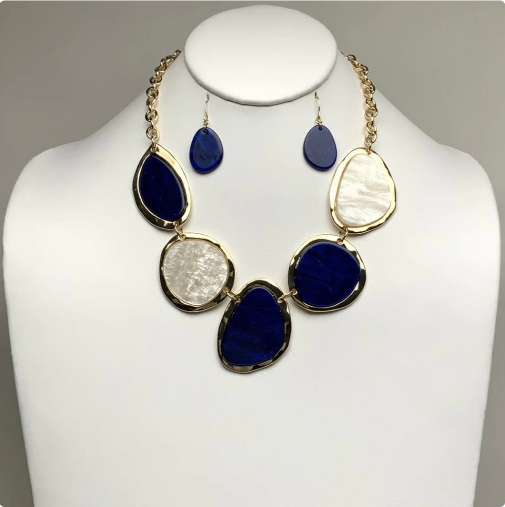 Make a statement from neck to ear. The Gold and Stone Necklace Set is a perfectly curated duo — a bold stone necklace paired with matching dangle earrings, all finished in gold. Available in classic White and rich Navy, this set is designed to elevate any outfit with effortless, coordinated elegance.