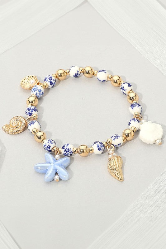 Sea Shell Ceramic Starfish Charm Beaded Stretch Bracelet