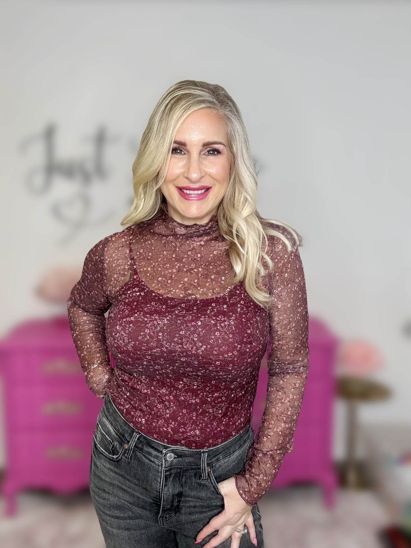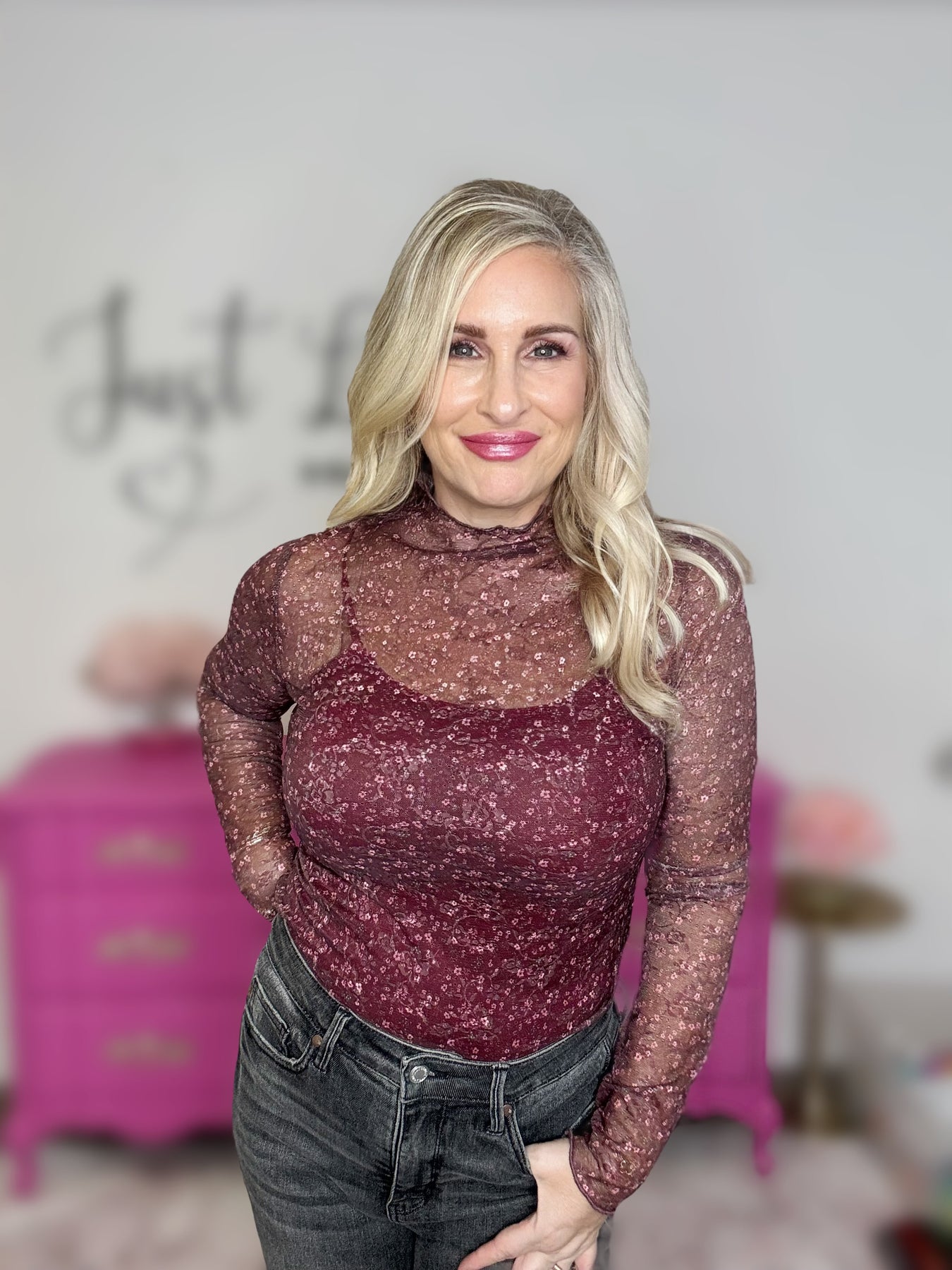 The Burgundy Lace Mesh Top combines elegance with subtle allure through its sheer mesh fabric and delicate ribbon pattern. Designed with long sleeves and a high mock neckline, it offers a chic, sophisticated look. Its unlined construction ensures breathable comfort, making it the perfect piece to elevate any outfit with style and confidence.