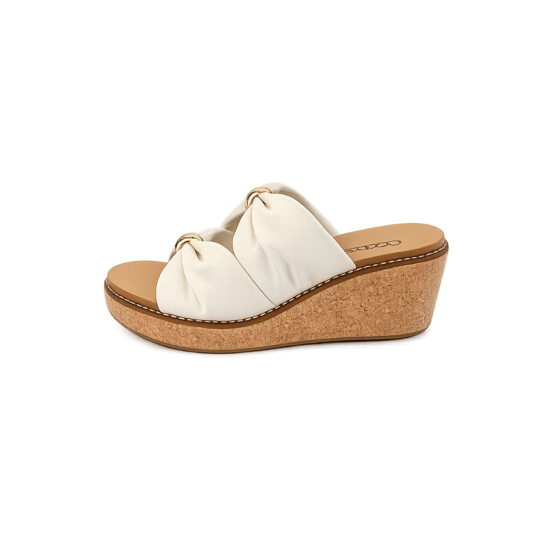 Crafted with two plush, ruched ivory straps adorned with polished gold ball hardware, these slides strike the perfect balance between playful and refined. Set atop a natural cork wedge platform, they deliver a lifted silhouette with all-day comfort — because looking good shouldn't hurt.