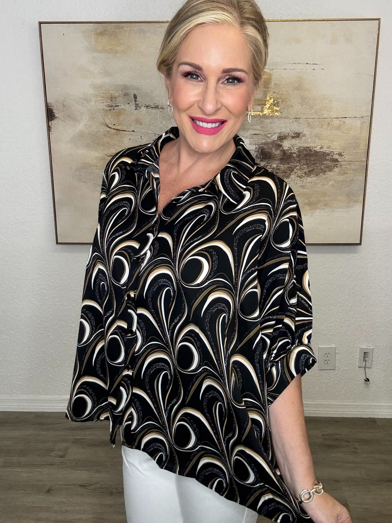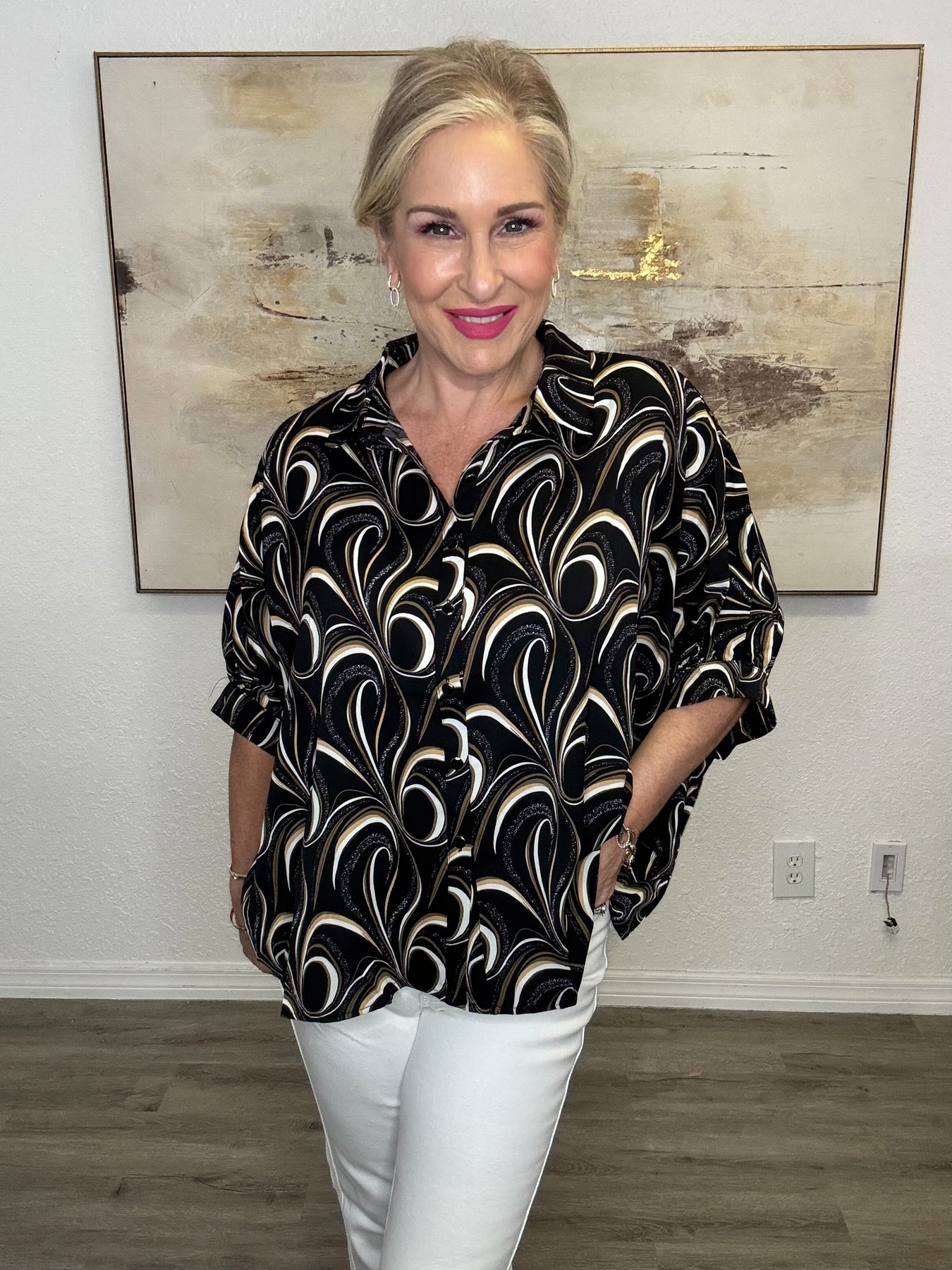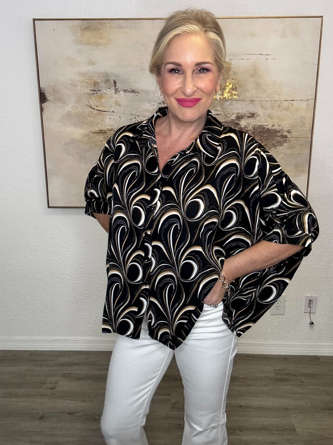 Embrace effortless style with this printed short sleeve blouse that's perfect for everyday wear. Featuring a classic collared neckline and button-down front, this versatile top is elevated by short dolman sleeves and thoughtful pinching detail in the back that adds visual interest. The loose fit silhouette ensures all-day comfort while maintaining a polished, put-together look. Pair it with jeans for a casual vibe or dress it up with tailored pants for the office.