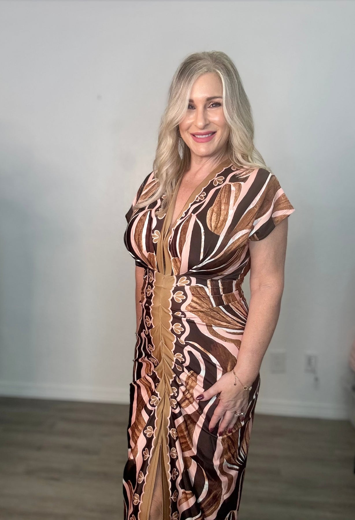 Elevate your style with this stunning V-neck midi dress featuring a golden brown abstract design, front pleated drape, and sexy front slit. Made from soft, stretchy jersey fabric, it hugs your curves in all the right places while keeping you effortlessly comfortable. Perfect for date nights, cocktail parties, or vacation dinners, this dress blends elegance and allure for the modern woman. Pair it with gold jewelry and nude heels for a flawless finish. Fits true to size.