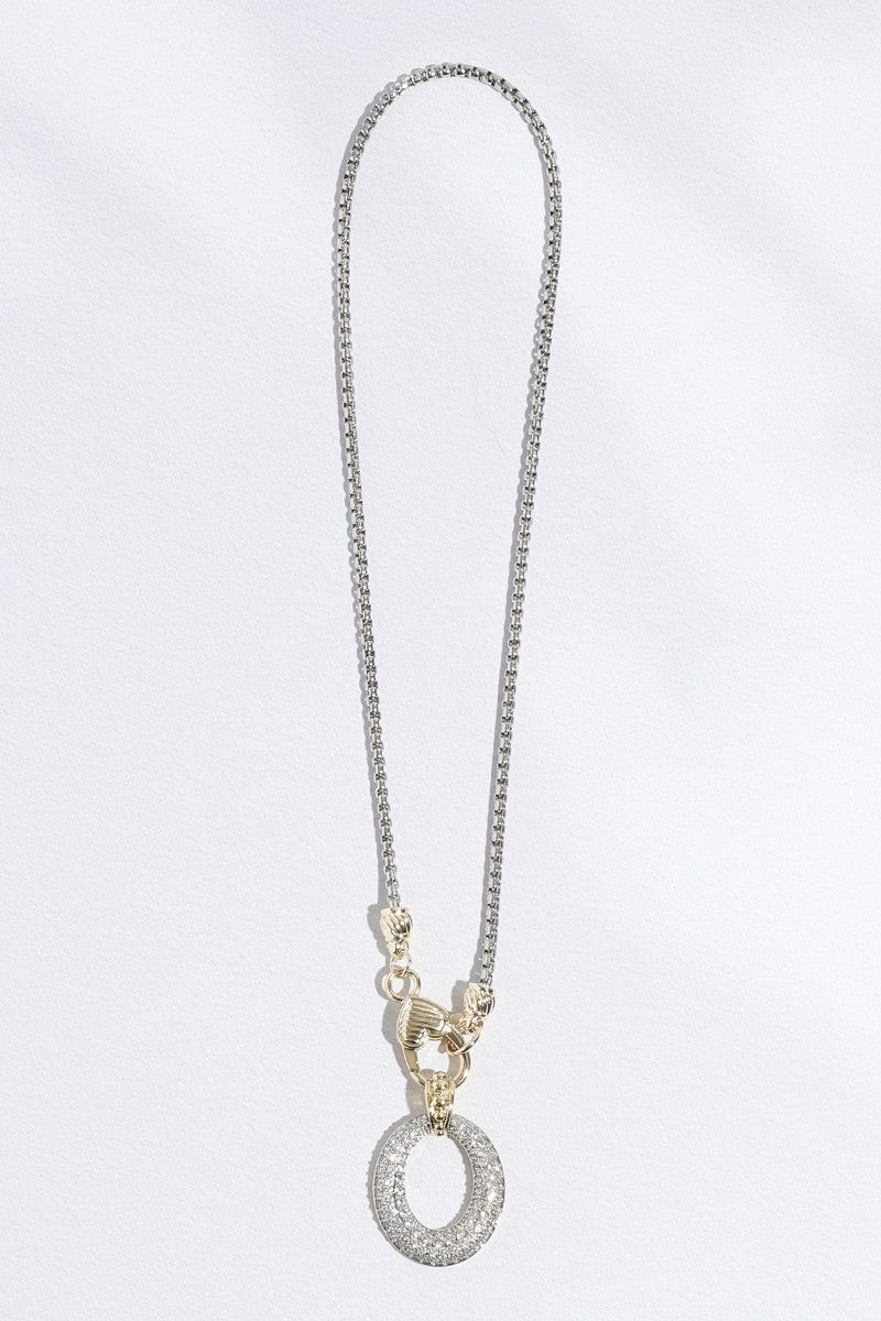 This versatile statement piece transitions effortlessly from day to evening. The mixed-metal design adds contemporary sophistication, while the CZ-encrusted open oval pendant brings eye-catching sparkle to any outfit.