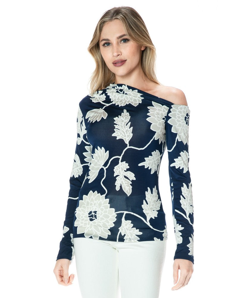 Make a statement with our Open Shoulder Ruched Detail Top featuring a beautiful navy floral pattern.