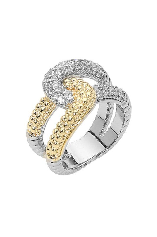Two Tone CZ Pave Twisted Crossover Ring