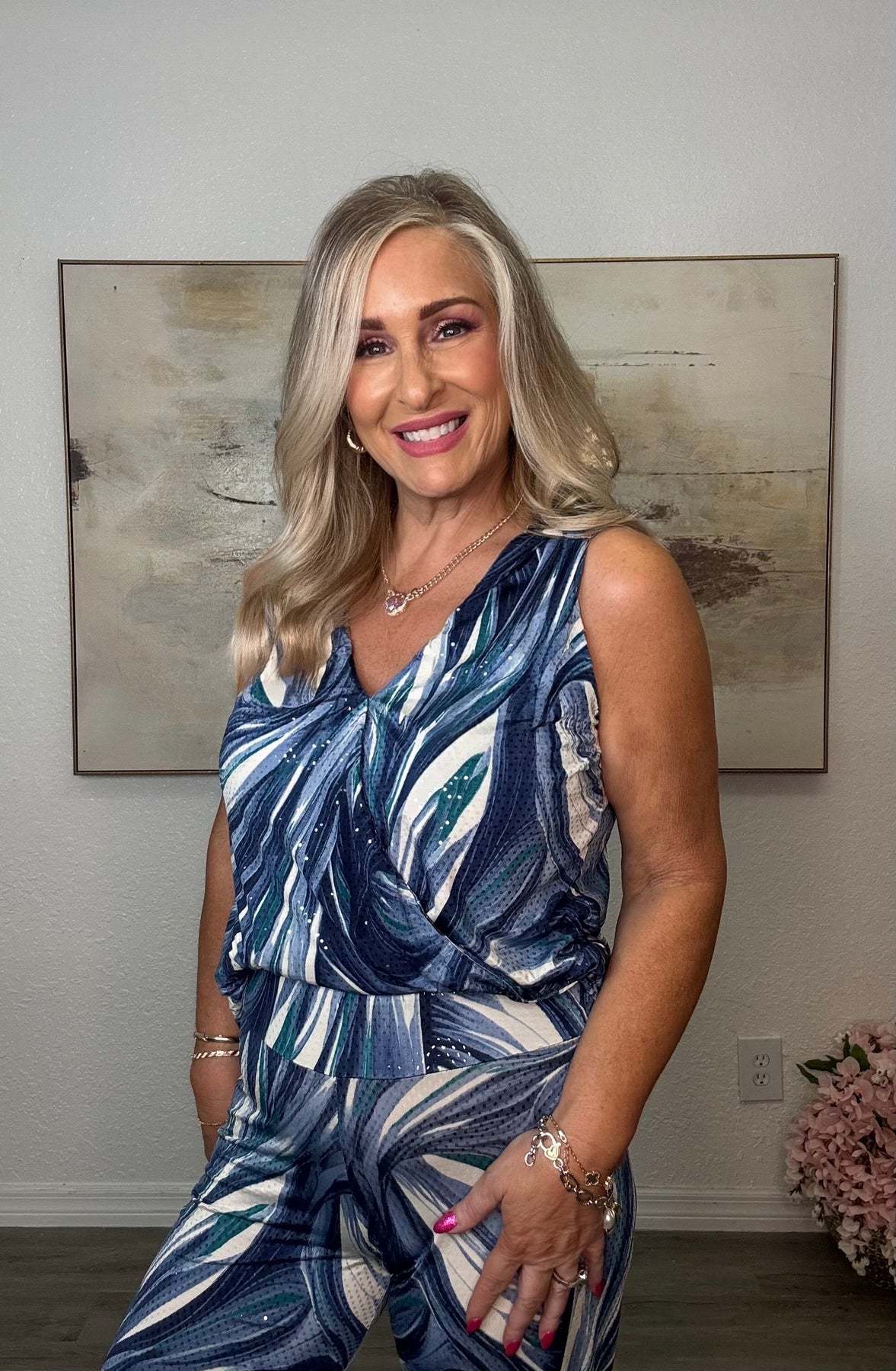 Vibrant and fresh, this tropical blue printed top brings effortless style to your wardrobe. The eye-catching print and flattering silhouette make it perfect for pairing with jeans, shorts, or skirts for a polished, put-together look.