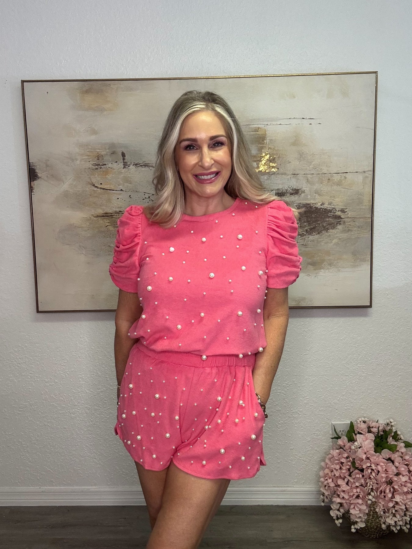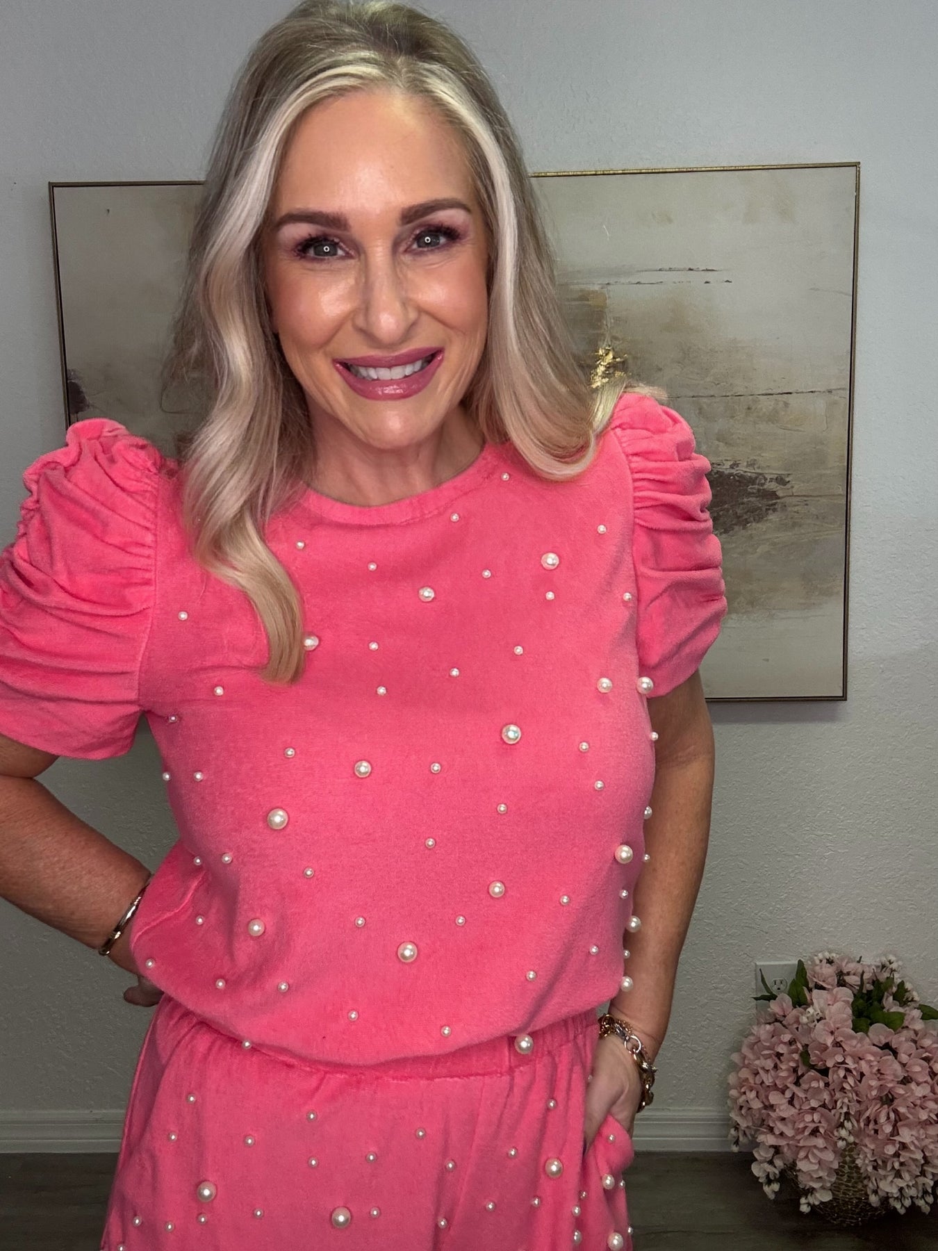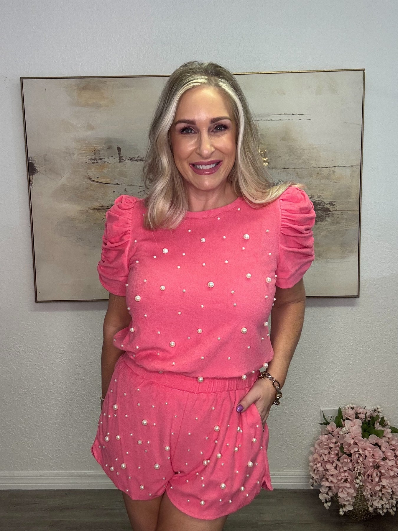 Imagine slipping into this cozy yet chic top on a weekend morning—the soft terry cloth feels luxurious against your skin while the scattered pearl details catch the light beautifully. Whether you're meeting friends for brunch, running errands in style, or simply relaxing at home, this versatile piece keeps you comfortable and polished. The boxy cut offers a relaxed, modern silhouette while the shirred sleeves add a touch of feminine charm. Pair it with your favorite jeans or leggings for an effortlessly put-together look that takes you from casual to chic with ease.