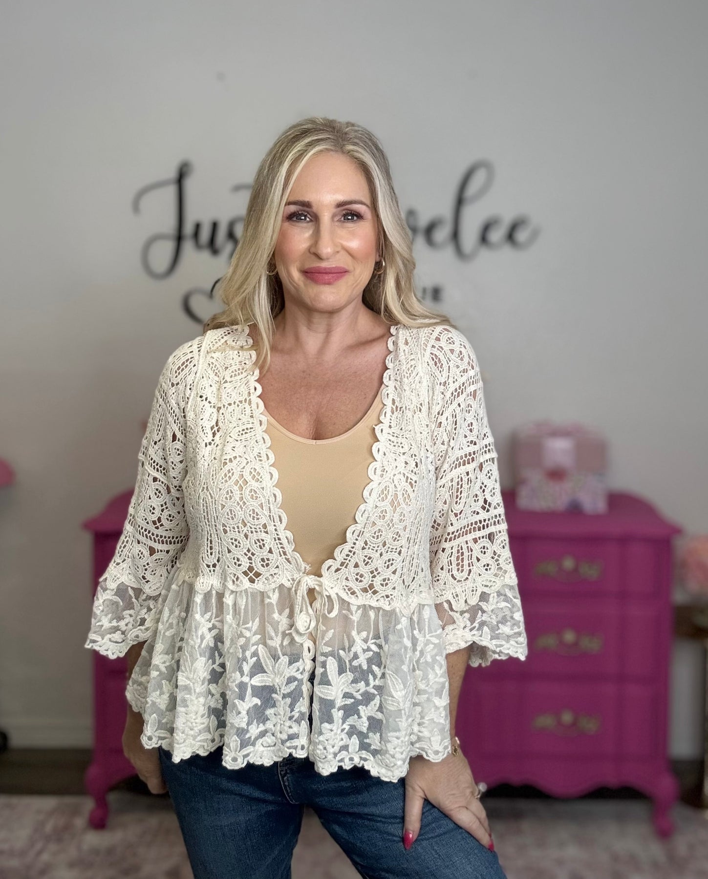 The Natural Crochet Cardigan combines intricate weave knit patterns and delicate floral lace detailing in a flattering V-neck, short sleeve design. Its regular fit offers comfort while showcasing a beautifully textured style that enhances any outfit. Perfect for layering, this cardigan brings a touch of natural elegance and effortless charm to your wardrobe. One size fits most.