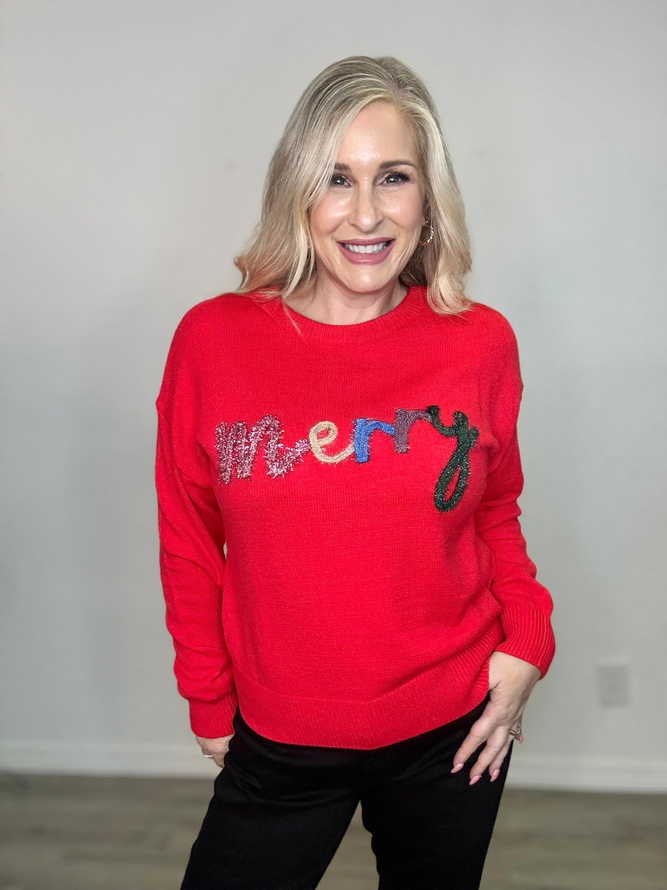 Celebrate the season in vibrant style with The Merry Tinsel Sweater Top. This multicolor knit pullover features a cozy round crew neckline, long sleeves, and a relaxed drop shoulder fit for all-day comfort. The festive "MERRY" tinsel graphic adds a playful holiday sparkle, making it the perfect Christmas sweater to brighten your winter wardrobe.