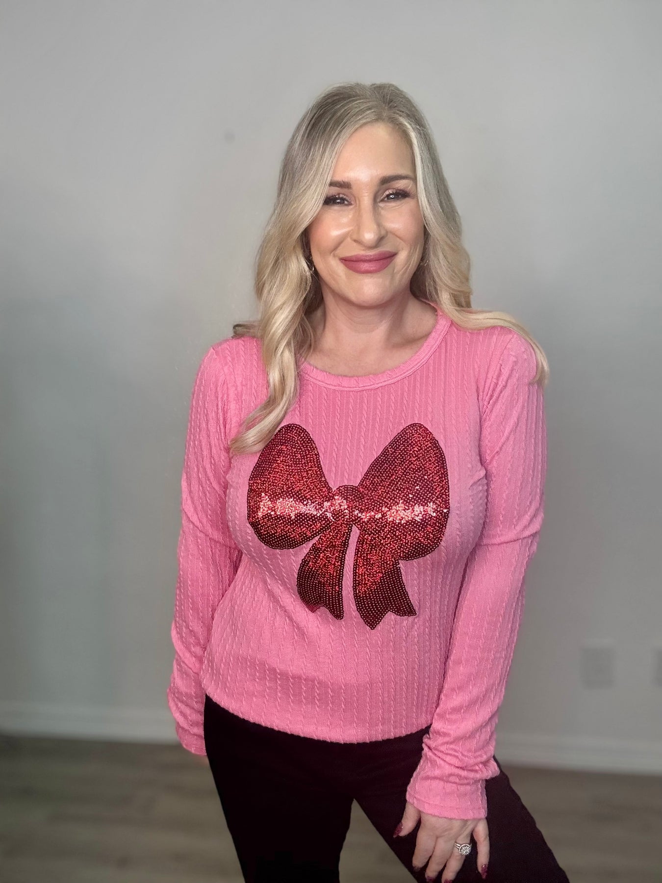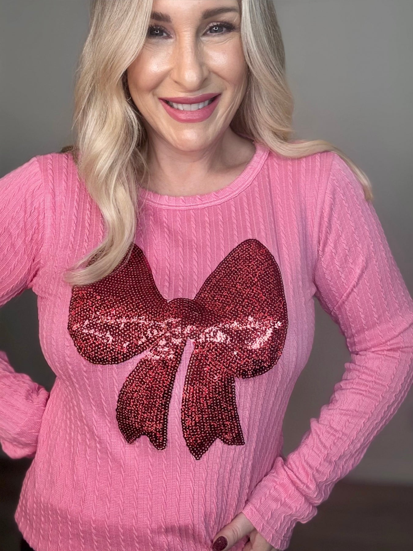 The Ribbed Sequin Ribbon Top blends comfort with a standout style. Crafted from soft, curly ribbed fabric, its long sleeves and round neckline provide a flattering silhouette for any occasion. The shimmering sequin ribbon patch adds a subtle yet captivating sparkle, making this top a versatile choice for both casual outings and dressier events.