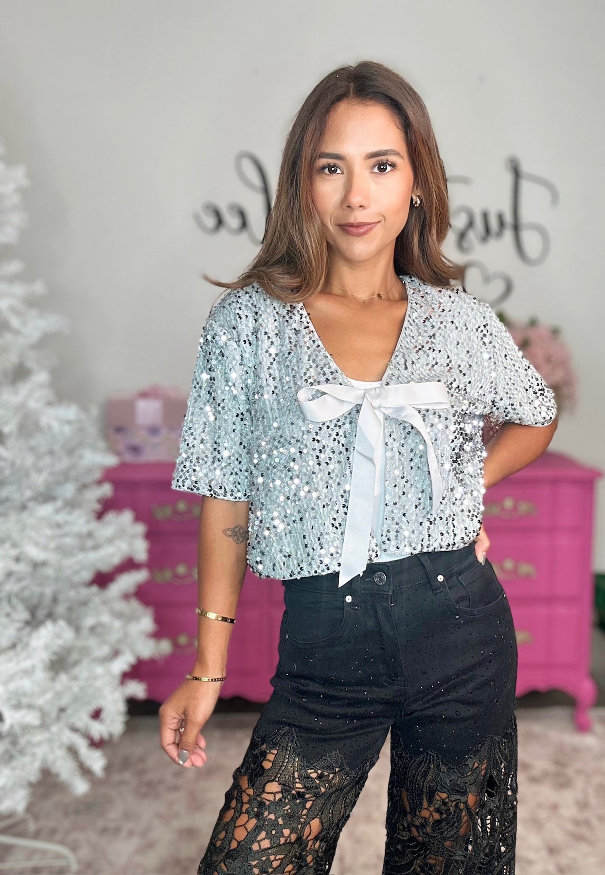 - Sequin tie cardigan crop top