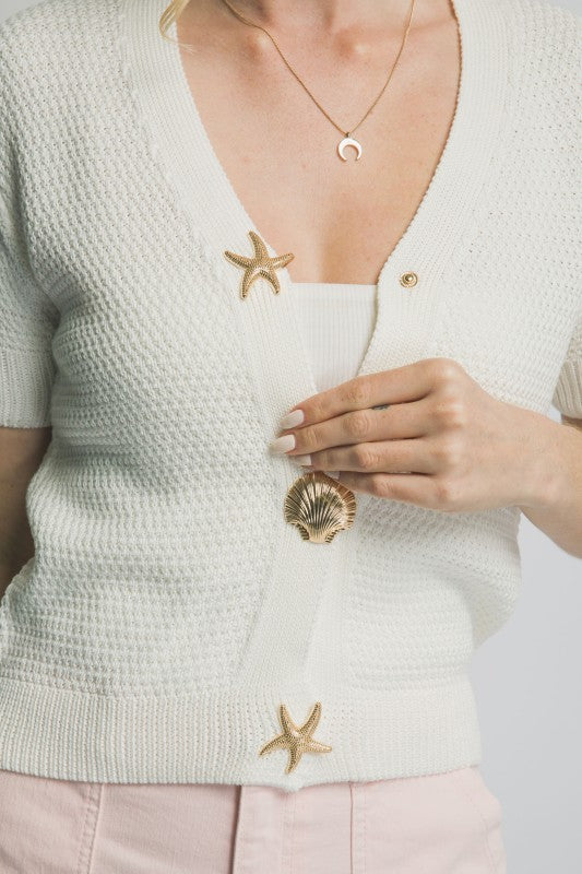 Embrace effortless coastal elegance with this charming v-neck top, featuring decorative shell and starfish buttons that bring a touch of seaside sophistication to your wardrobe. The flattering v-neck silhouette and relaxed short sleeves create a breezy, feminine look perfect for warm-weather styling.