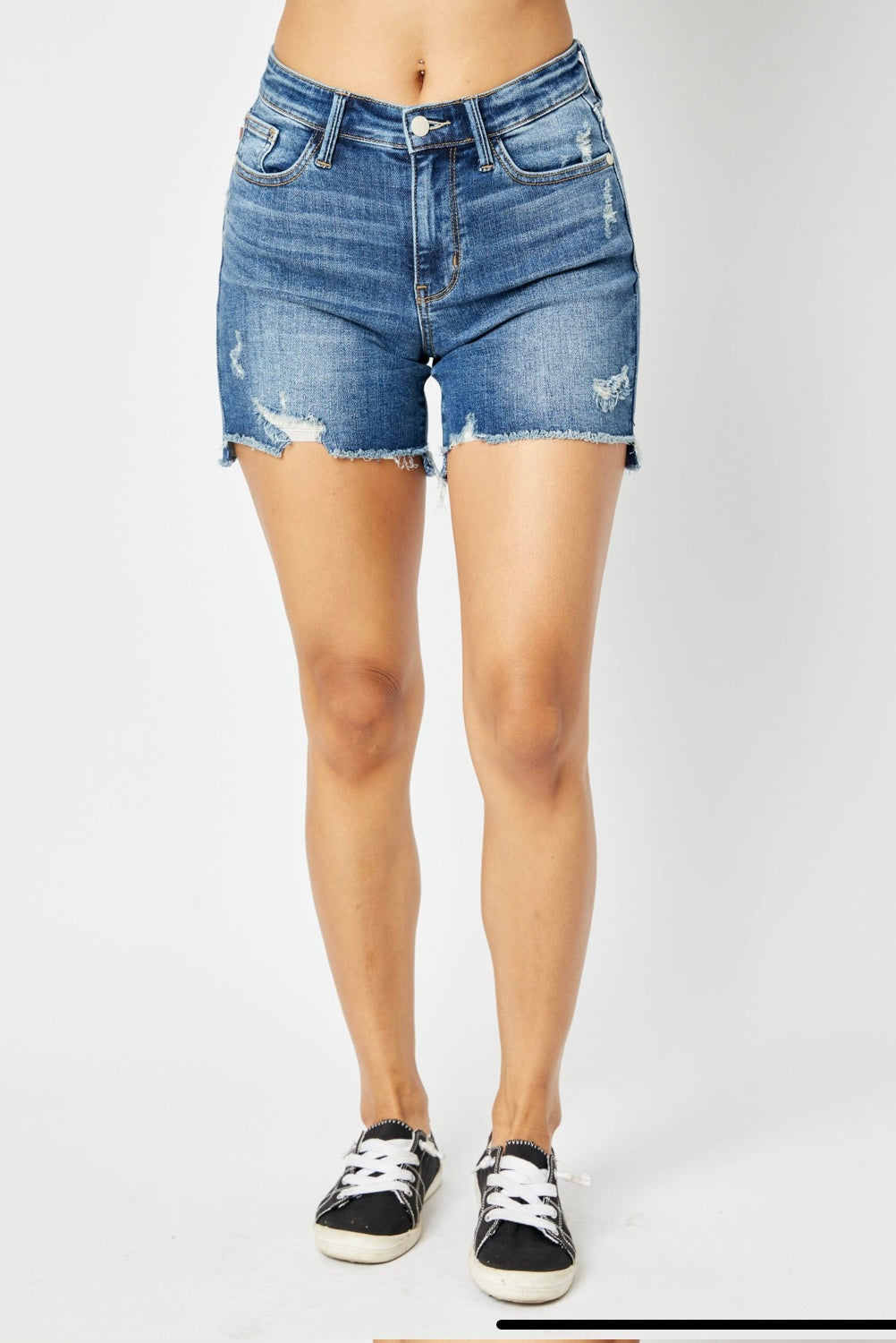 These Judy Blue Mid-Rise Destroy Shorts combine edgy style with comfortable wear. Featuring a flattering mid-rise fit and a trendy hi-lo cut hem, they add a modern twist to your casual look. The distressed details provide a cool, lived-in vibe, perfect for effortless summer style. Whether you're out for a day of fun or a casual night out, these shorts offer both comfort and fashion-forward appeal.
