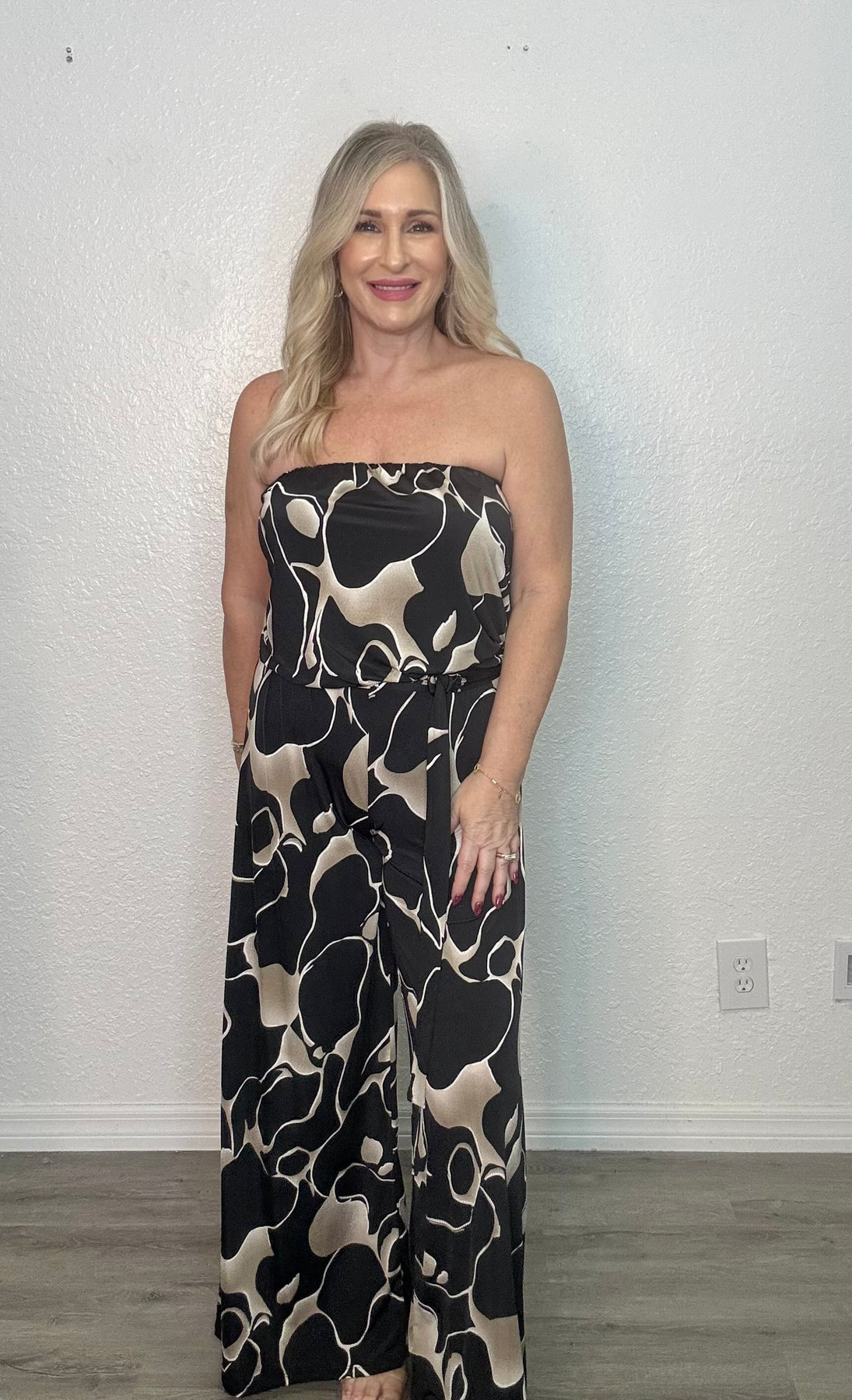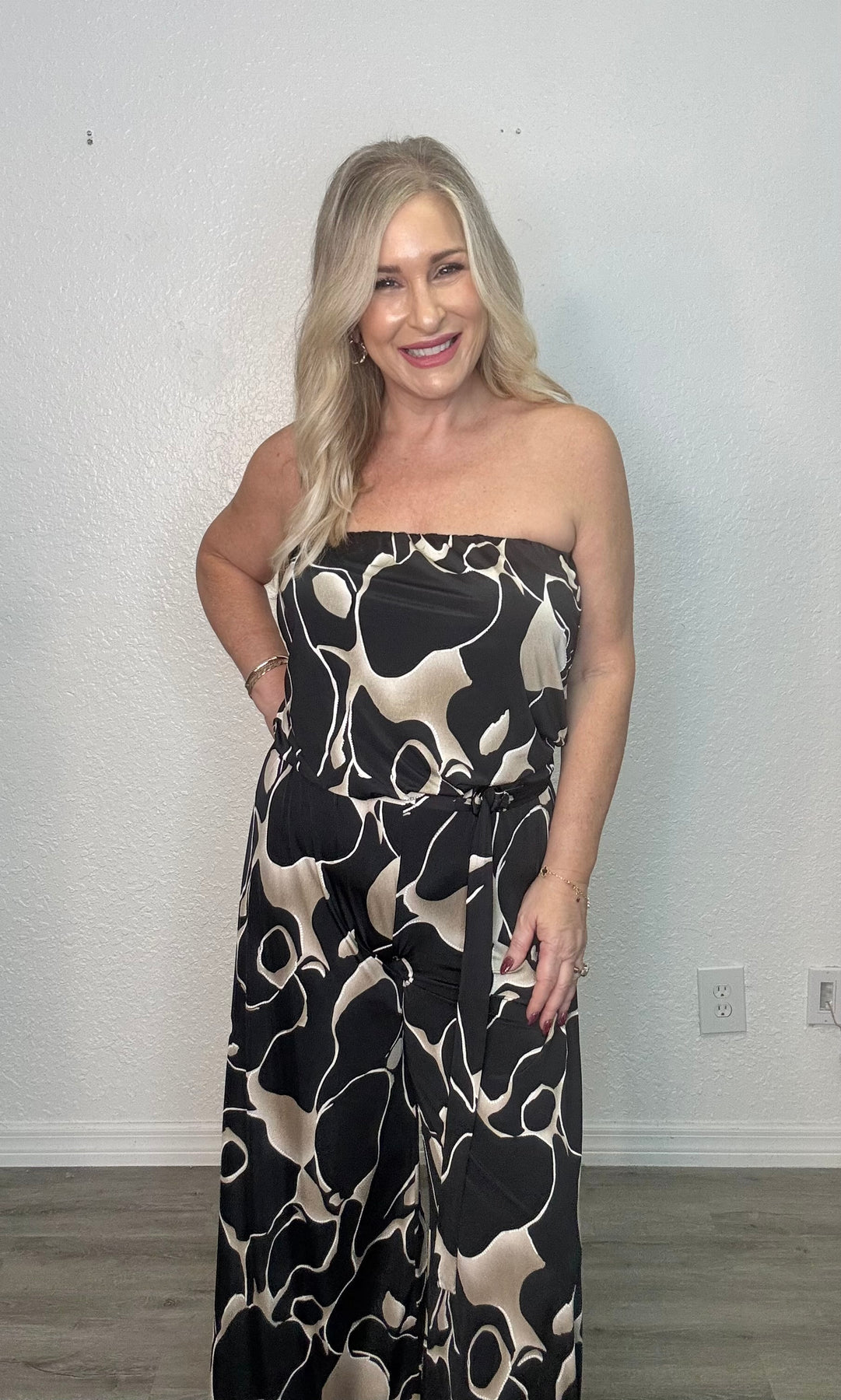 The Midnight Wide Leg Jumpsuit combines style and comfort with its relaxed, true-to-size fit and stretchy fabric. Designed to move with you, it features a flattering ring belt that defines your waist, while the wide-leg silhouette offers a modern, elegant look. Perfect for day-to-night wear, this jumpsuit makes dressing effortless and chic.