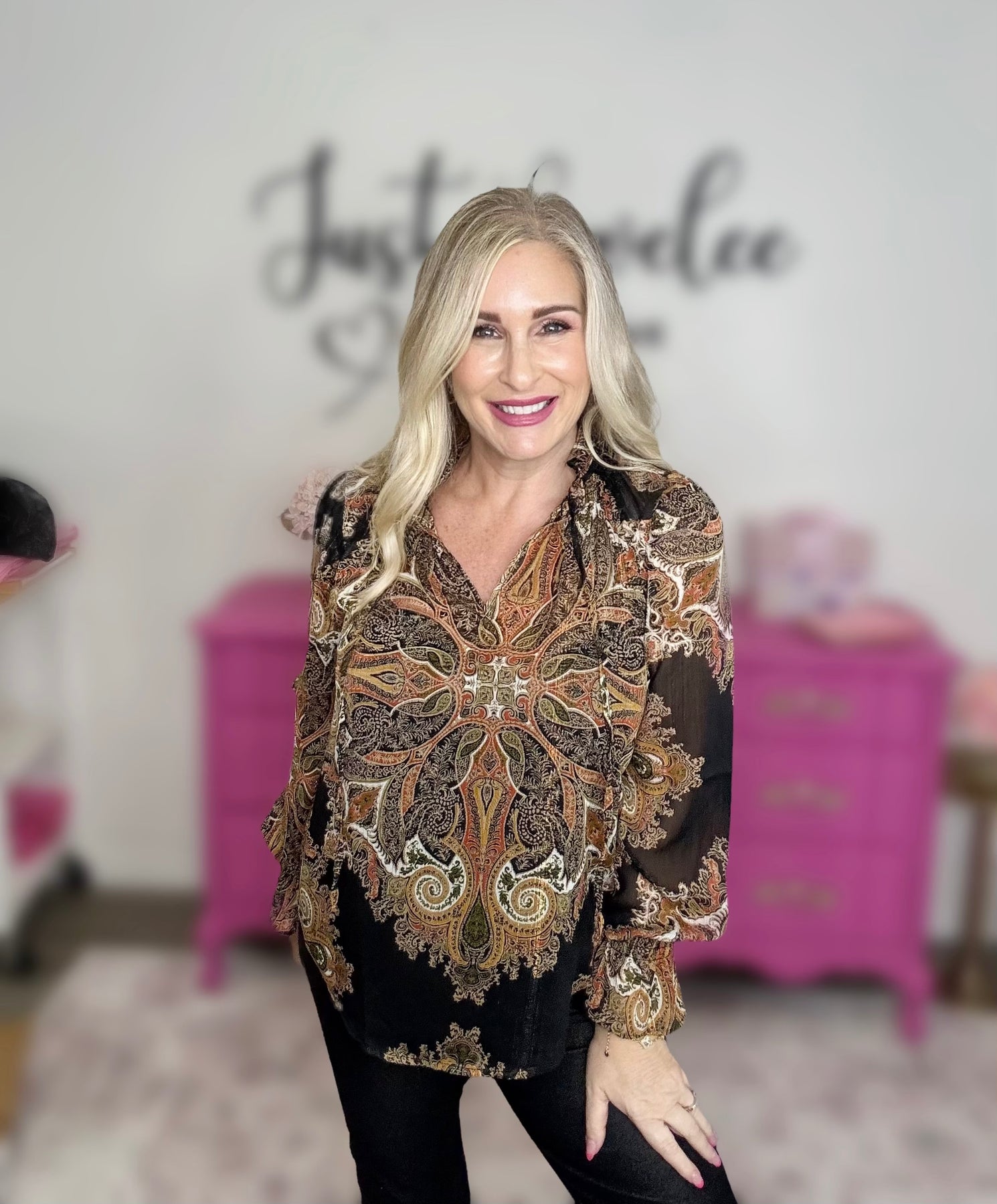 The Black Tie Front Peasant Top combines a sheer black and rust paisley print with an attached black cami for effortless layering. Its lightweight, breathable fabric offers a comfortable fit, while the tie-front design adds a stylish, feminine touch. Perfect for transitioning from day to night, this top delivers both elegance and ease.