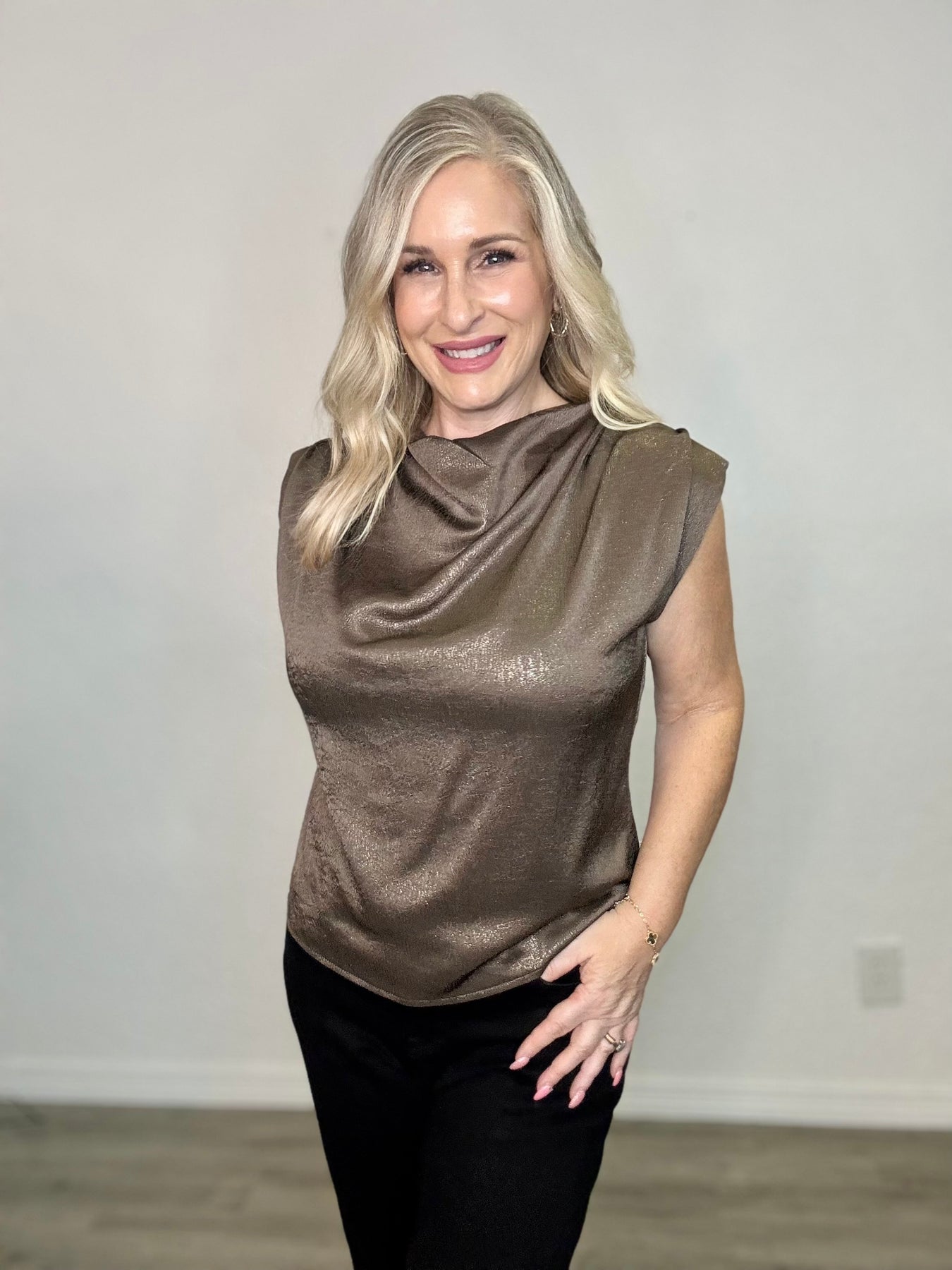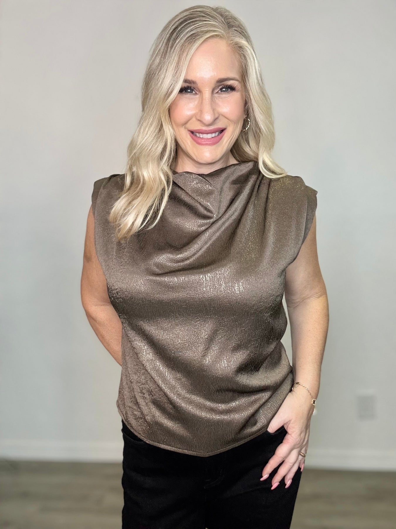 Add a touch of subtle glam to your wardrobe with our Metallic Mocha Sleeveless Top — the perfect mix of chic and effortless style. Designed with delicate pleating at the shoulders for a soft draped silhouette, this top flatters every figure while offering a relaxed yet refined look. The metallic mocha hue adds just the right amount of shimmer, making it a stunning choice for both daytime wear and evening outings.